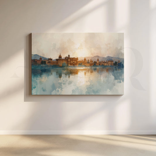 This Udaipur palace watercolor canvas painting blends soft pastel tones with serene reflections, creating a...