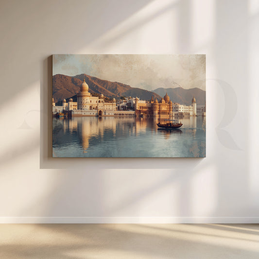 This Udaipur Lake Palace canvas painting showcases majestic architecture set against calm waters and scenic...