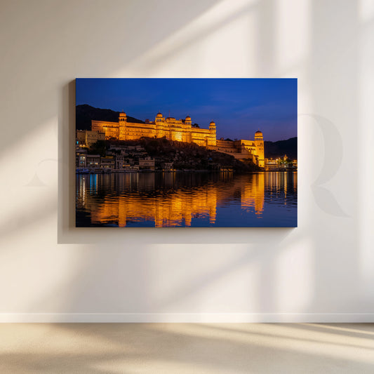 This Udaipur City Palace night canvas painting captures the grandeur of illuminated architecture reflecting over...