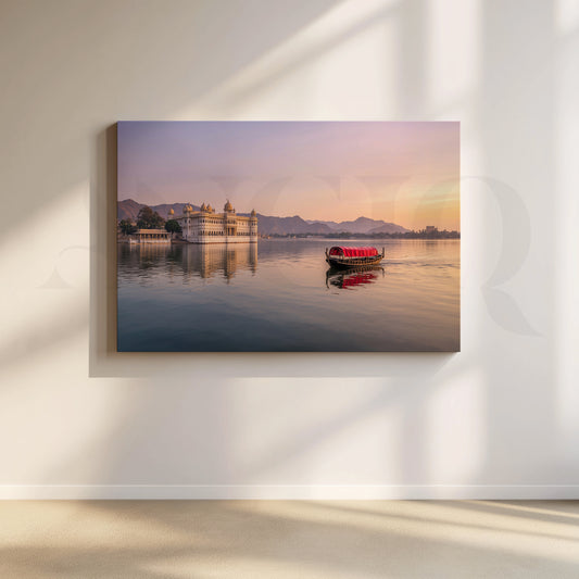 This Lake Palace Udaipur canvas painting captures a tranquil sunset over calm waters, with a...