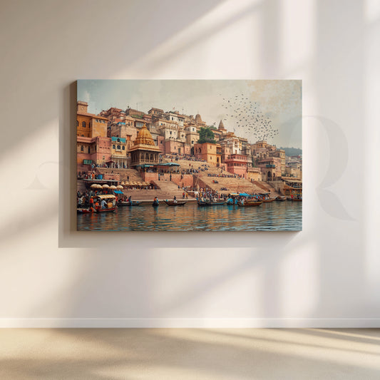 This Varanasi ghats canvas painting captures the vibrant life along the river with boats, historic...