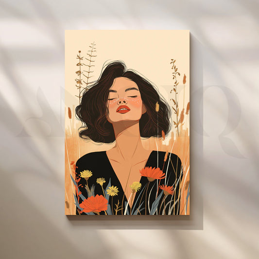 Breathe in calm with this minimalist canvas painting of a woman basking in wildflowers and...