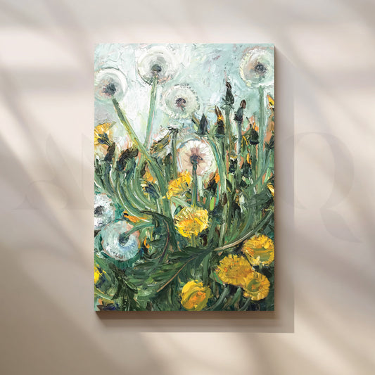Capture a summer daydream. This vibrant painting features a field of dandelions, their fluffy seeds...