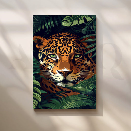 A striking leopard portrait peeking through lush jungle leaves, rendered in rich emerald, umber, and...
