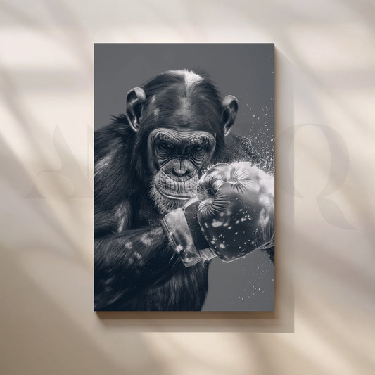 A gritty, photo-real chimp in boxing gloves punches through a smoky grayscale field, delivering bold...