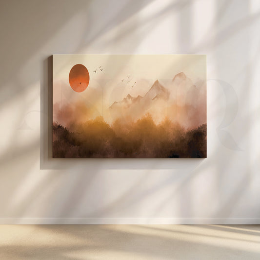 This beautiful canvas painting captures the tranquility of sunrise over mist forests and mountains in...