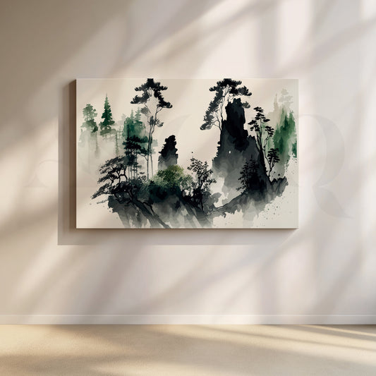 Immerse yourself in a world of serene mystery. This canvas landscape captures a misty forest...