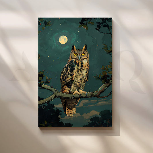 A serene owl perched under a glowing moon—deep teal night sky, soft starry accents, and...