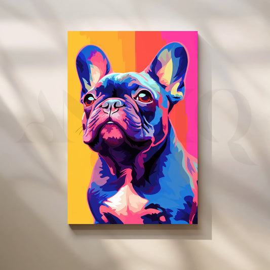 Vibrant and playful, this pop art dog print splashes hot pink, electric blue, and sunshine...