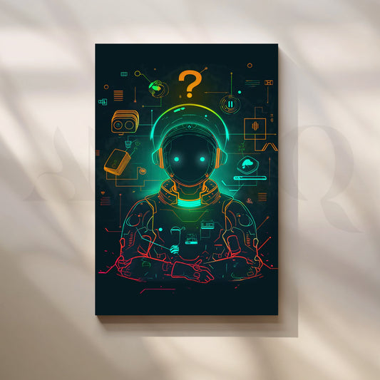 Glow-line illustration of a friendly robot framed by circuitry icons and a radiant halo, rendered...