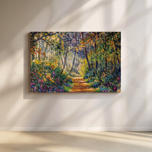Escape into a vibrant world with this captivating painting. Sunlight spills through a path winding...