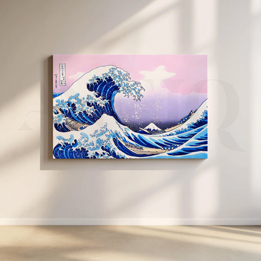 This dreamy reinterpretation of Hokusai’s Great Wave blends soft lilac skies with deep indigo surf...