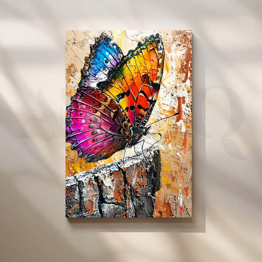 Vibrant butterfly wall art in layered, impasto texture—magenta, orange, yellow, and electric blue wings perched...