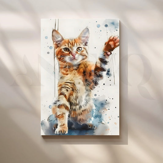 Sweet and lively, this watercolor kitten raises a paw amid soft pastel splashes—perfect for a...