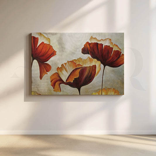 This vibrant painting features a field of red poppies with hints of orange. The flowers...