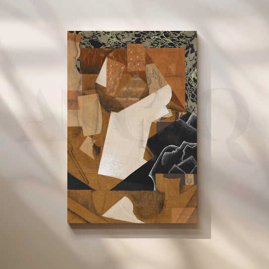 Warm sepia collage of intersecting forms and a profile silhouette evokes classic cubism with a...