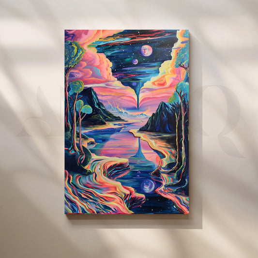 Dream in color with a tranquil otherworld: mirrored waters, soft neon clouds, and celestial orbs...