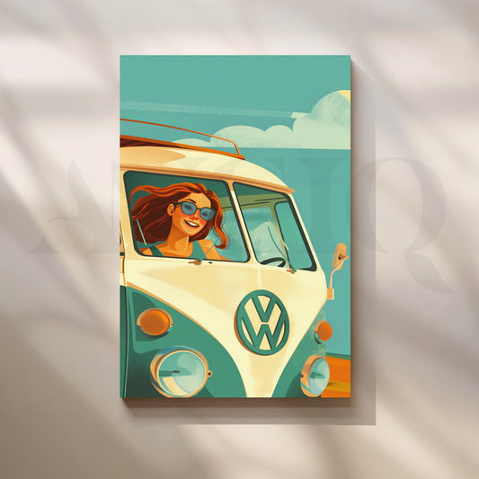 Sun-washed illustration of a smiling traveler leaning from a classic teal van beneath breezy skies—clean...