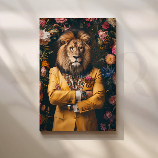 A regal lion in a patterned suit against a lush floral backdrop creates a striking,...