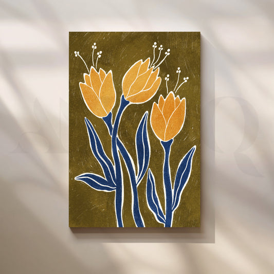 Three Golden Blooms Boho Art: This artwork showcases three golden flowers in full bloom, their...