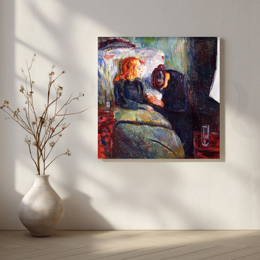 Rendered in rich reds, charcoal blacks, and mossy greens, this expressive Munch scene captures tenderness...