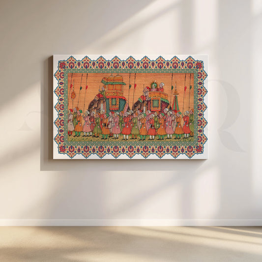 The Mughal-style painting of this grand elephant procession is a perfect representative of the Indian...