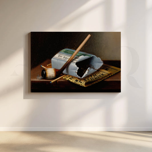 This minimal yet striking Anciq artwork features a pipe, matches, and tobacco pouch arranged with...