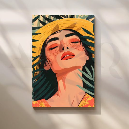 Vibrant and uplifting, this contemporary canvas features a freckled woman in a wide-brim hat, eyes...