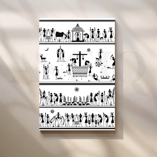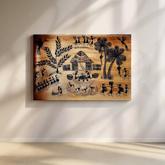 Celebrate rustic charm with this Warli village scene—tribal dancers around a bonfire, palm trees and...