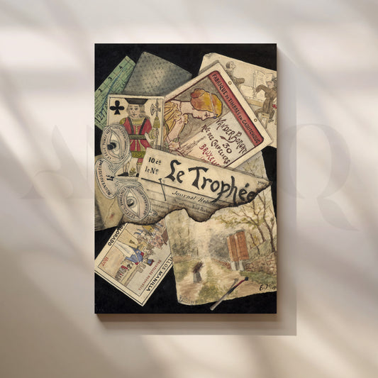 A unique Anciq canvas artwork showcasing vintage playing cards, handwritten notes, and nostalgic paper clippings....