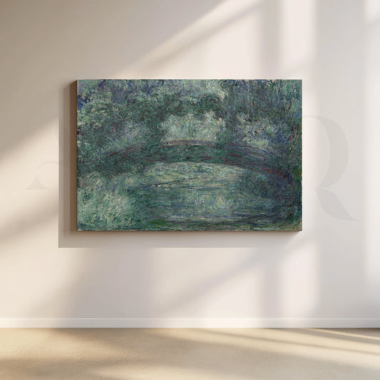 Bring calm to your space with this Monet-inspired modern wall art—a serene green bridge over...
