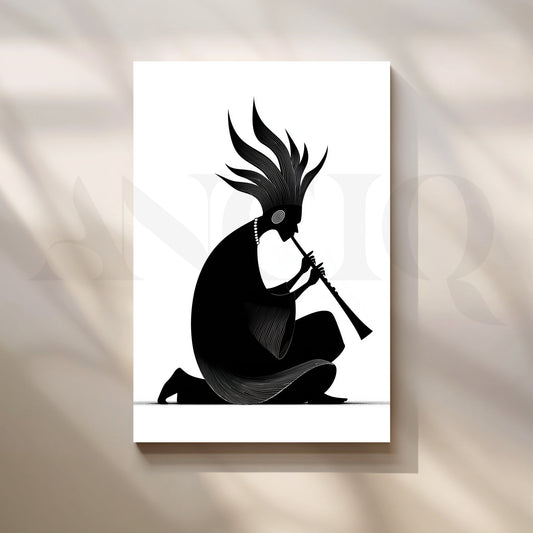 This monochrome Anciq canvas portrays a tribal musician kneeling and playing a wind instrument. The...