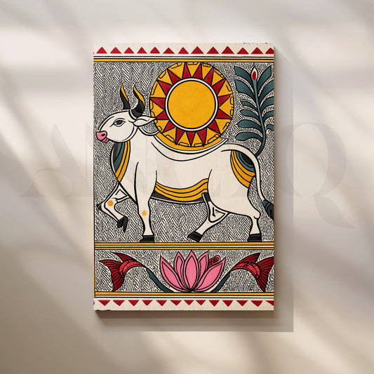 A radiant white bull strides beneath a golden sun and lotus in classic Madhubani linework...
