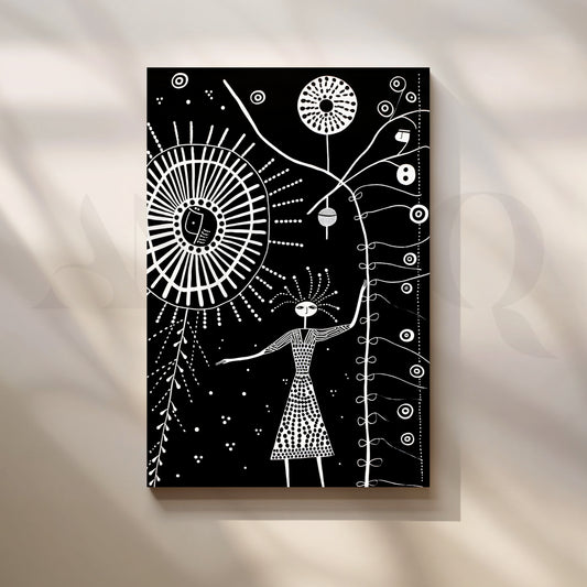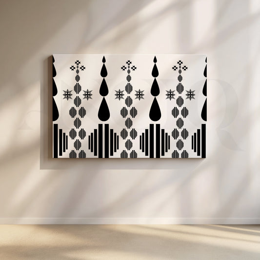 This Anciq canvas features bold black geometric shapes—teardrops, lines, and stars—arranged in rhythmic harmony. A...