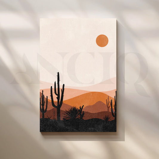 Soft desert layers in peach, clay, and blush fade into a minimalist sun, framed by...