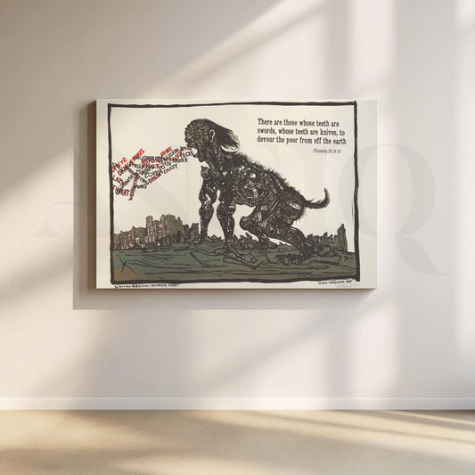 Anciq ‘Devour the Poor’ Canvas Artwork illustrates a dark, beast-like figure with biblical references and...