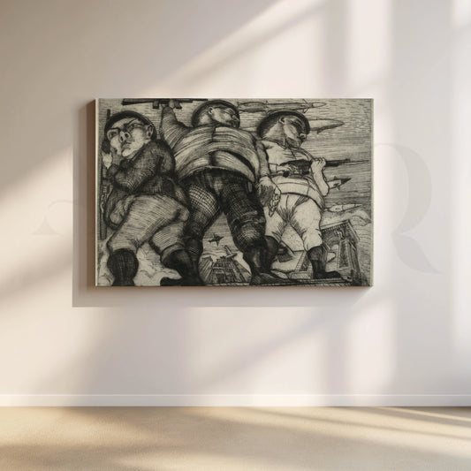 Anciq ‘March of the Soldiers’ Canvas Artwork captures three grotesquely exaggerated soldiers in motion—etched with...