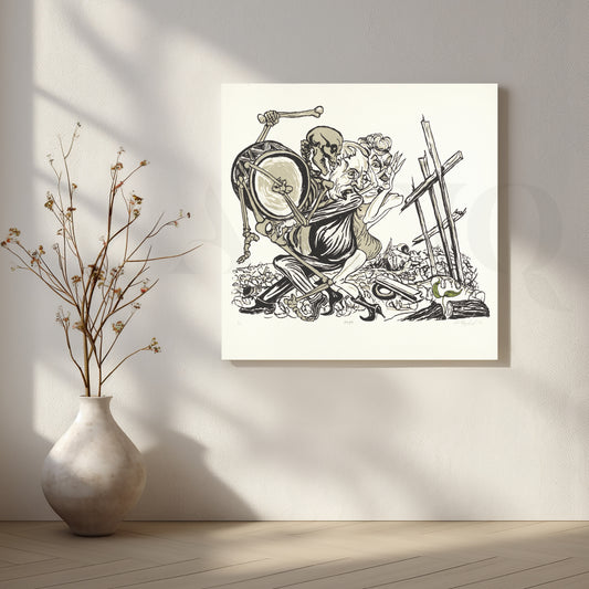 Anciq ‘Skeleton Dance of Society’ Canvas Artwork features hand-drawn skeletal satire on societal roles, mortality,...