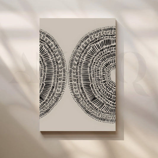 This minimalist tribal pattern abstract canvas artwork features intricate black radial markings set against a...
