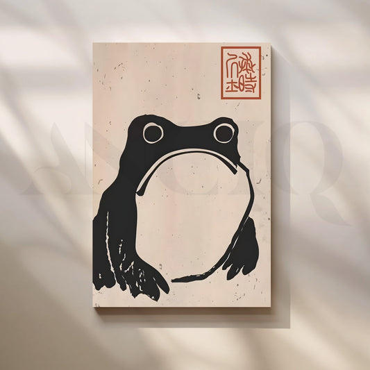 This minimalist black frog graphic canvas artwork features a bold, playful silhouette set against a...