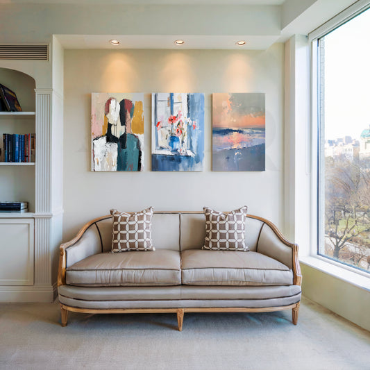 Anciq ‘Soft Horizon Harmony’ Gallery Wall features soothing abstract textures and pastel tones for a...