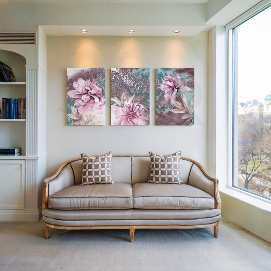 Anciq ‘Dusty Rose Bloom’ Gallery Wall features soft florals layered over dreamy textured backgrounds, perfect...