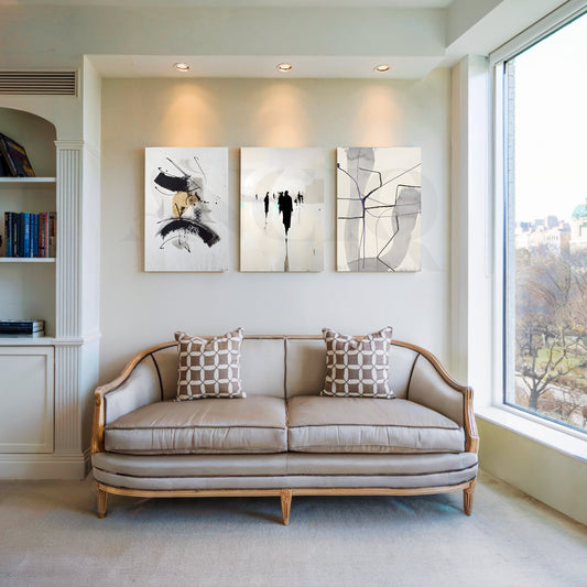 Anciq ‘Urban Mist Abstractions’ Gallery Wall pairs fluid brushstrokes, soft silhouettes, and linear forms in...