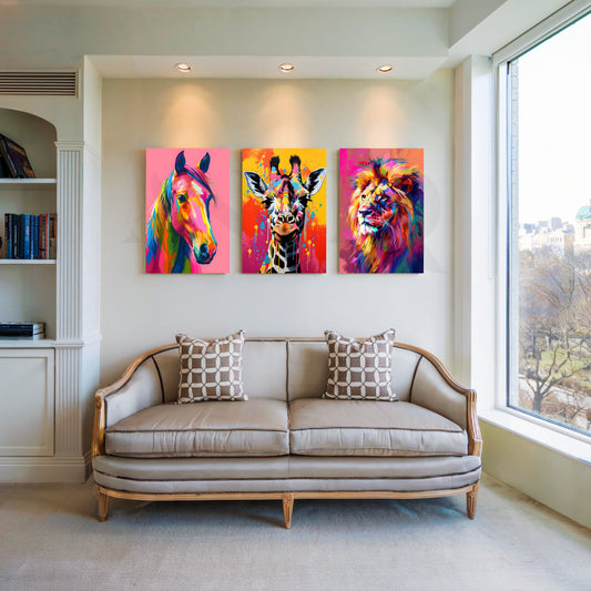 Anciq ‘Neon Safari Royals’ Gallery Wall features a vivid horse, quirky giraffe, and majestic lion...