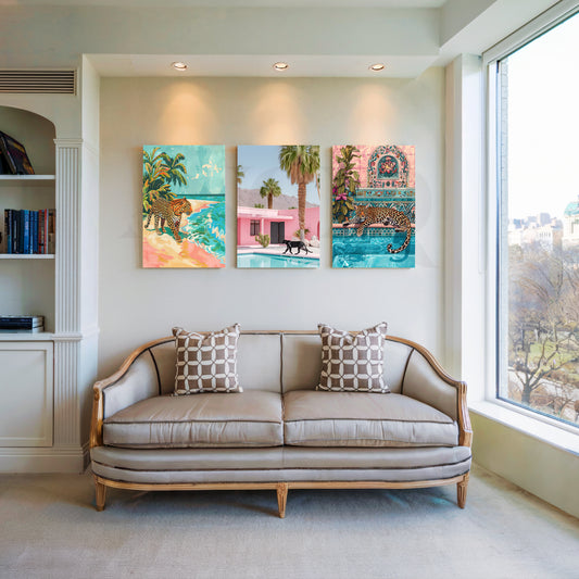 Anciq ‘Tropical Panther Escape’ Gallery Wall blends dreamy beaches, poolside villas, and lounging leopards in...