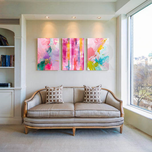 Anciq ‘Candy Cloud Abstracts’ Gallery Wall splashes your space with playful strokes of pink, yellow,...