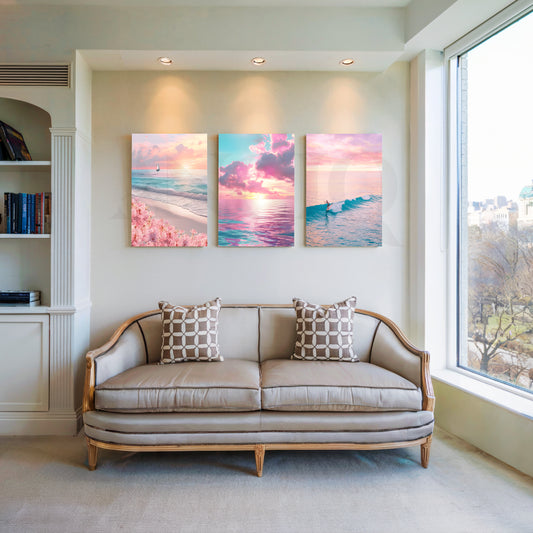 Anciq ‘Pastel Sunset Shores’ Gallery Wall captures dreamy ocean views, soft pink clouds, and serene...