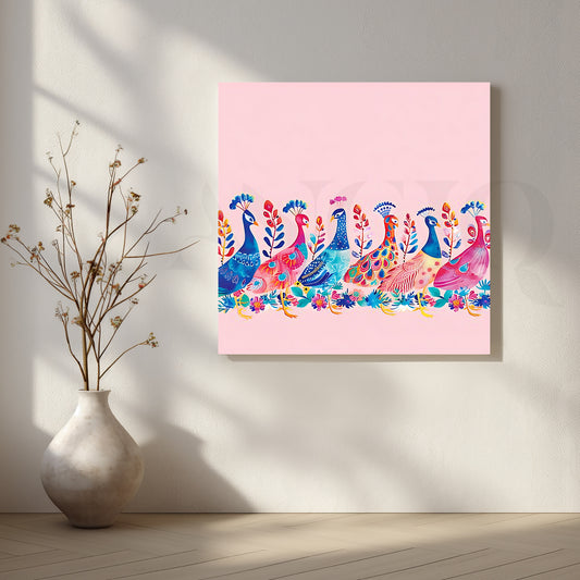 This joyful canvas showcases a row of vibrant peacocks painted in bright blues, pinks and...