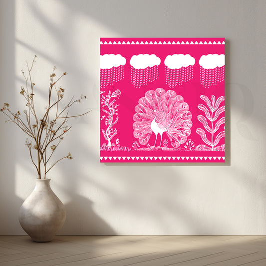 Pink Warli Peacock Rain Dance Canvas Art showcases a graceful peacock, trees and falling rain...