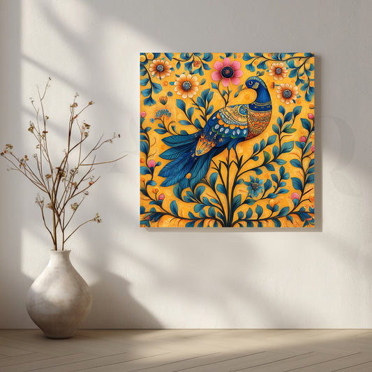 A beautifully detailed bird illustrated with intricate Indian folk motifs and surrounded by bright floral...